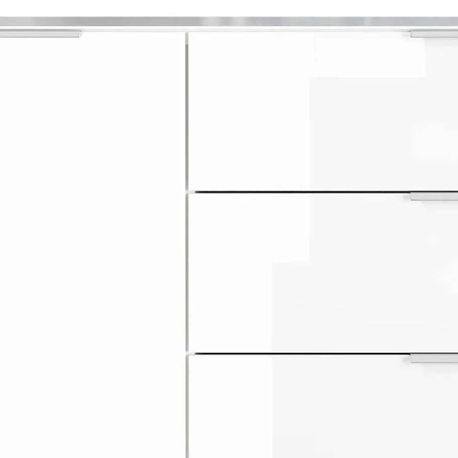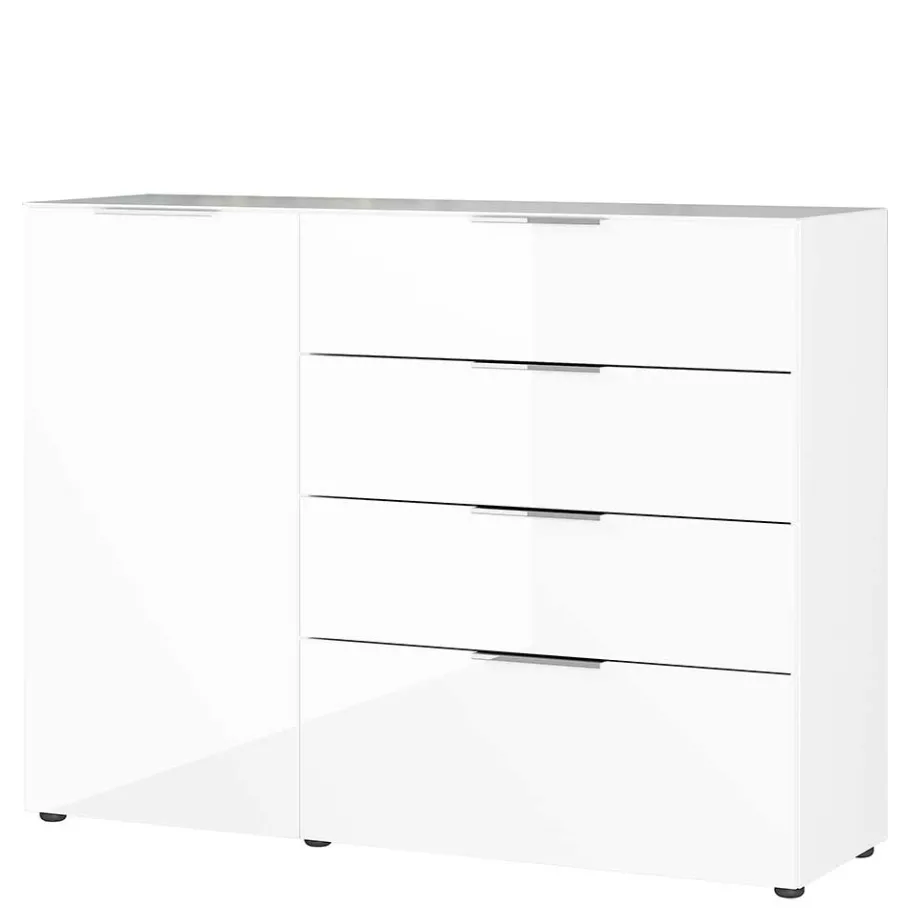 Dezente Metall-Kantengriffe in Chromfarben verleihen der Kommode einen modernen und eleganten Touch. Diese Griffe sind nicht nur stilvoll, sondern auch praktisch und leicht zu greifen. Die schwarzen Kunststofffüße mit einer Höhe von ca. 2 cm sorgen für einen stabilen Stand und eine moderne Optik. Ein Möbelstück, das durch seine stilvollen Details und die hochwertige Verarbeitung überzeugt.