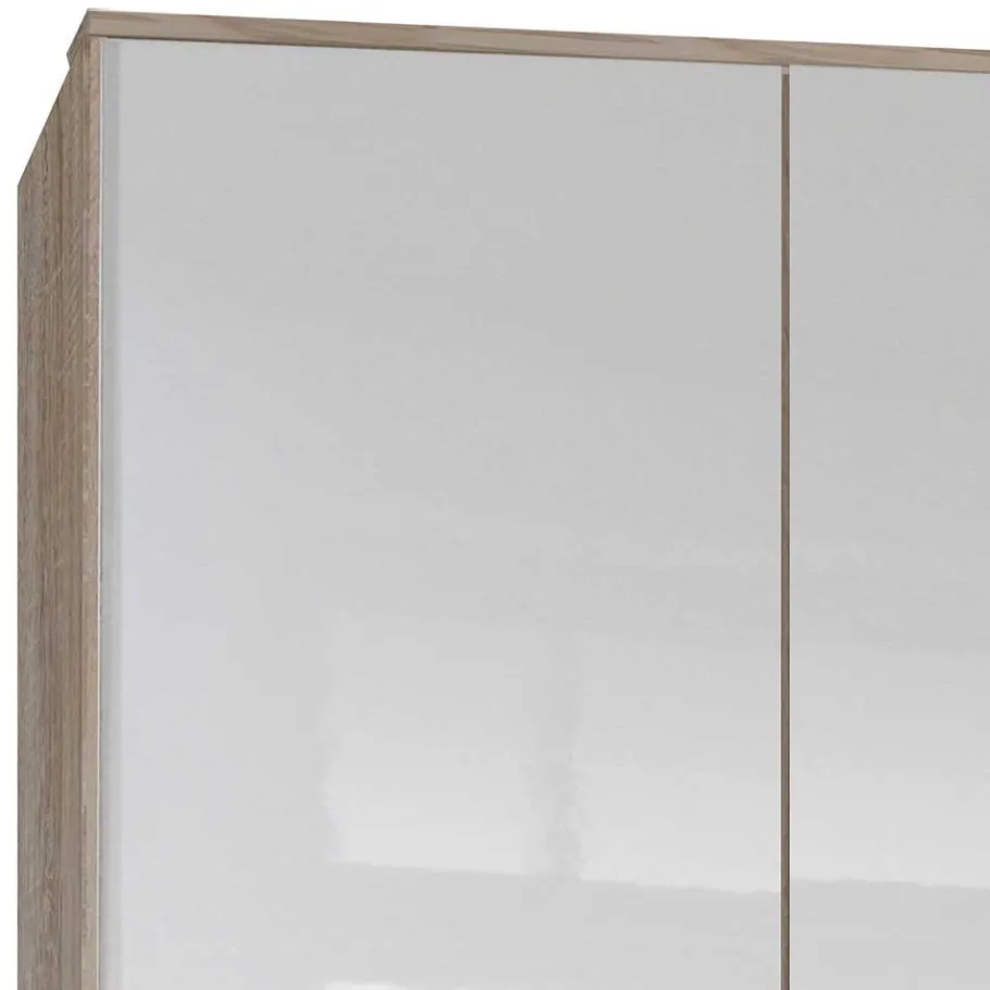 Der Schlafzimmerschrank „Grands“ besticht durch sein modernes Design und seine hohe Funktionalität. Hergestellt in Deutschland, steht dieser Schrank für Qualität und Zuverlässigkeit. Die Kombination aus pflegeleichten Holzoptik-Oberflächen in Eiche Sägerau und hochglänzend weißen Fronten verleiht Ihrem Schlafzimmer ein frisches, zeitgemäßes Ambiente. Der hochglänzende Lack schützt die Fronten nicht nur vor Kratzern und Abnutzung, sondern sorgt auch für ein elegantes, makelloses Aussehen.