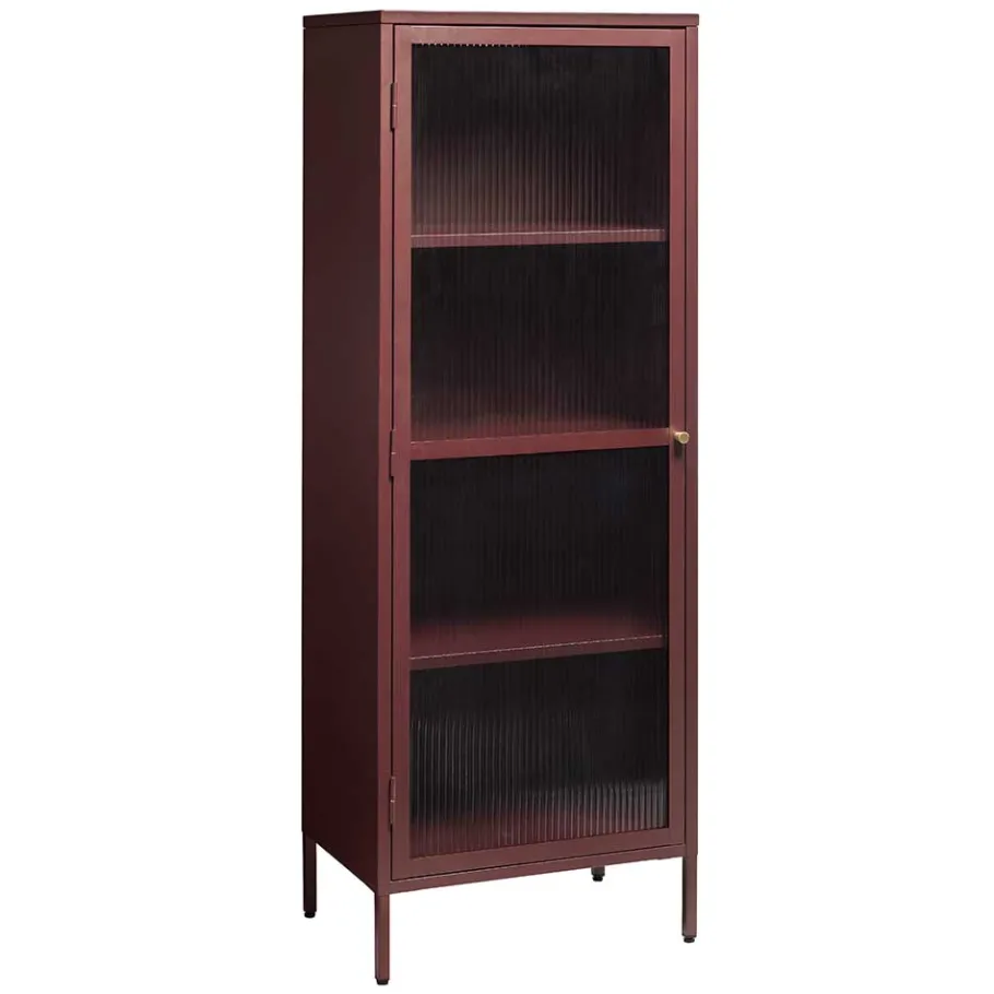 Mit einer Breite von 58 cm, einer Höhe von 160 cm und einer Tiefe von 40 cm bietet die Vitrine „Enno“ reichlich Stauraum, ohne viel Platz in Anspruch zu nehmen. Die gerippte Glasfront, umrahmt von robustem Metall, verleiht dem Möbelstück einen exklusiven Look und schützt gleichzeitig Ihre wertvollsten Gegenstände. Der goldfarbige Knopfgriff aus Metall setzt dabei einen edlen Akzent. Hinter der eleganten Tür verbergen sich drei verstellbare Einlegeböden, die jeweils bis zu 20 kg belasten können und somit vielseitige Lagerungsoptionen bieten.