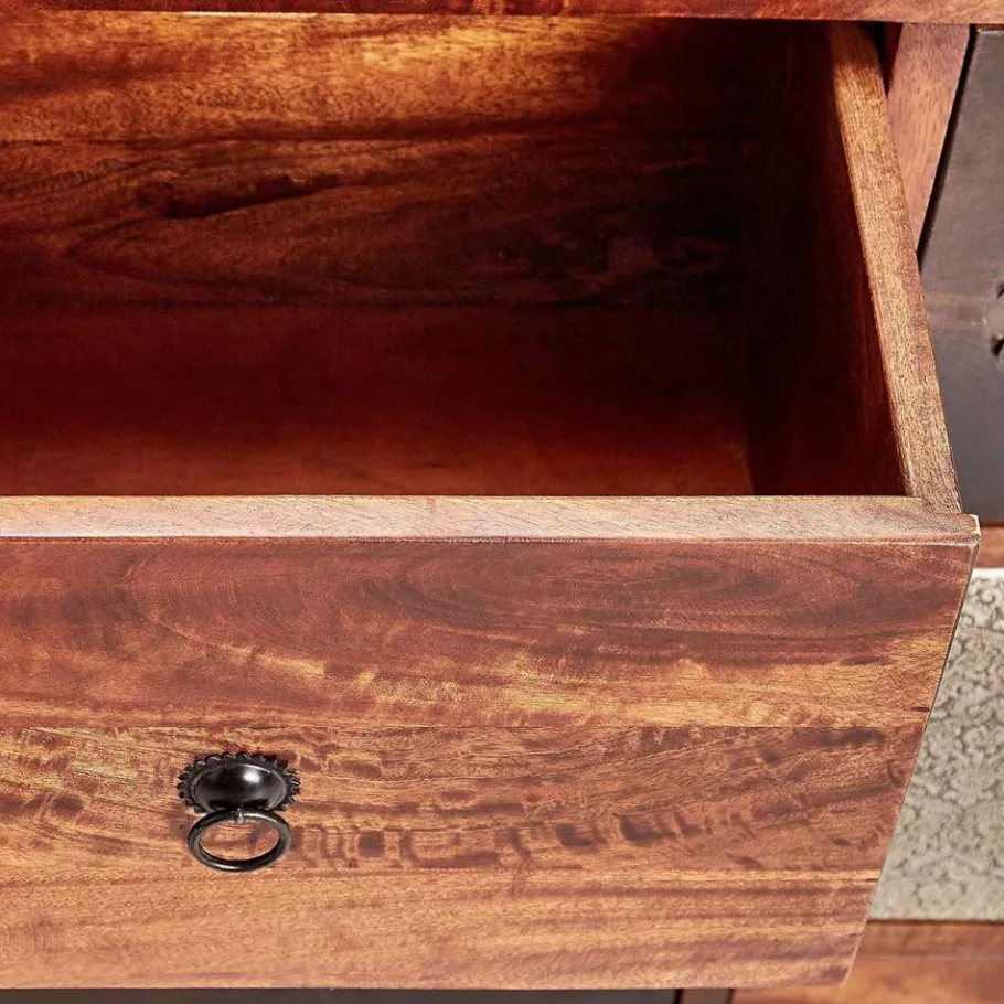 Mit insgesamt acht Schubladen bietet Ihnen die „Welina“ ausreichend Stauraum für all Ihre persönlichen Gegenstände. Die unterschiedlichen Größen der Schubladen ermöglichen eine vielseitige Nutzung, während die rustikalen Metall-Ringgriffe in Silberfarben einen charmanten Kontrast zum Holz bieten.