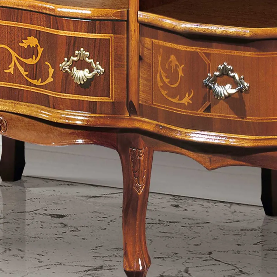 Die floralen Einlegearbeiten und die detailverliebten Abschlüsse an der Front des Lowboards sind wahre Hingucker. Die eleganten, im Antikstil gehaltenen Metall-Bügelgriffe fügen sich nahtlos in das Gesamtbild ein und runden das Design ab.