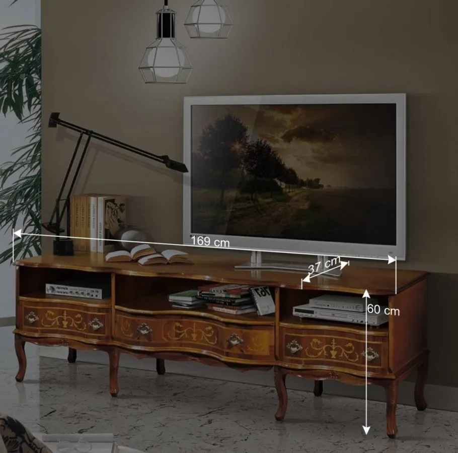 Mit seinen beeindruckenden Maßen von 169 cm Breite, 60 cm Höhe und 37 cm Tiefe bietet das Lowboard nicht nur eine stilvolle Bühne für Ihren Fernseher, sondern auch ausreichend Stauraum. Die drei offenen Gerätefächer in zwei Größen sind ideal für Mediengeräte, während die drei Schubladen zusätzlichen Platz für Zubehör bieten. Der traditionelle Holzauszug der Schubladen unterstreicht das authentische Design und sorgt für eine leichte Bedienbarkeit.