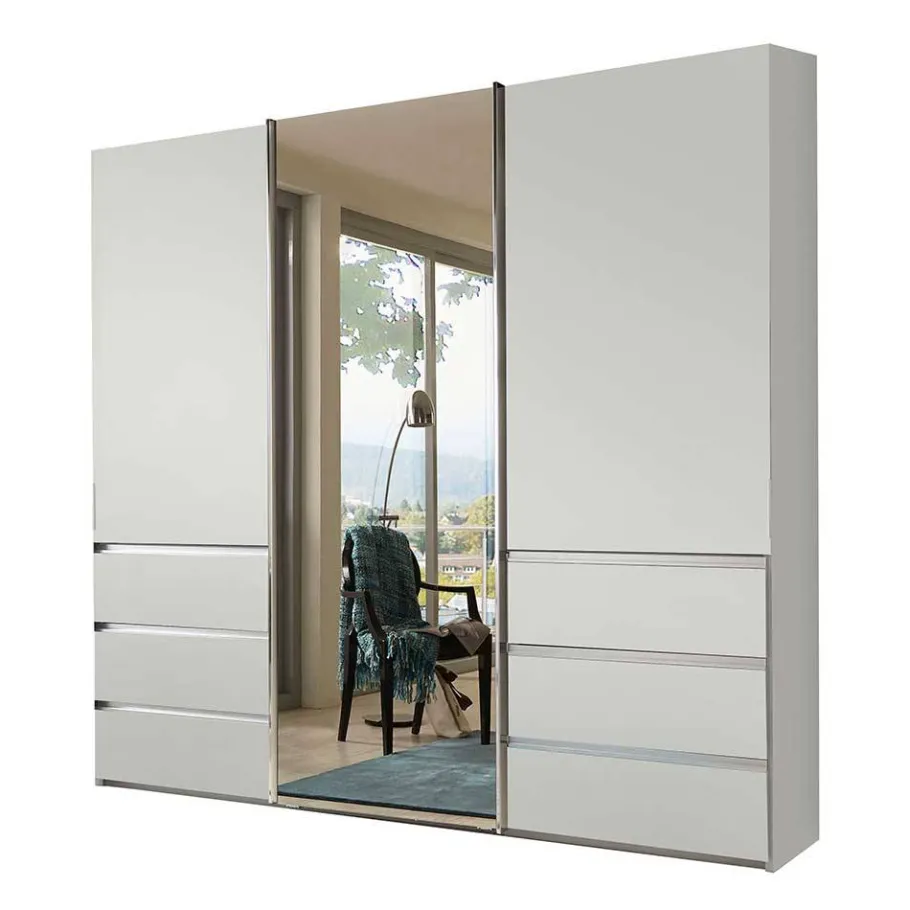 Die chromfarbenen Metall-Griffleisten unterstreichen den modernen Look des Kleiderschranks und erleichtern das Öffnen und Schließen der Türen. Der stabile Stand auf einem Sockelgestell sorgt für zusätzliche Stabilität und Sicherheit.