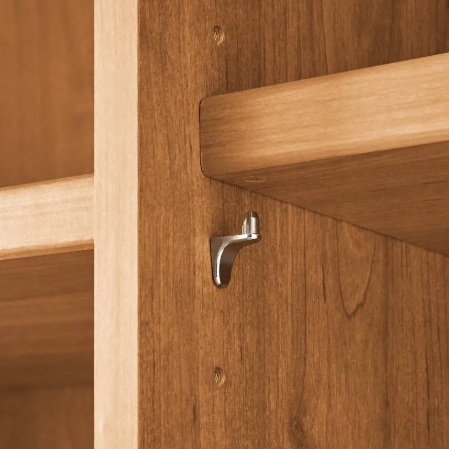 Alle Türen sind mit Soft-Close-Metallscharnieren ausgestattet, die ein sanftes und leises Schließen gewährleisten. Trotz der stabilen Sockelkonstruktion muss der Schrank zur Kippsicherung zusätzlich an der Wand befestigt werden – so steht er zuverlässig und sicher im Alltag.