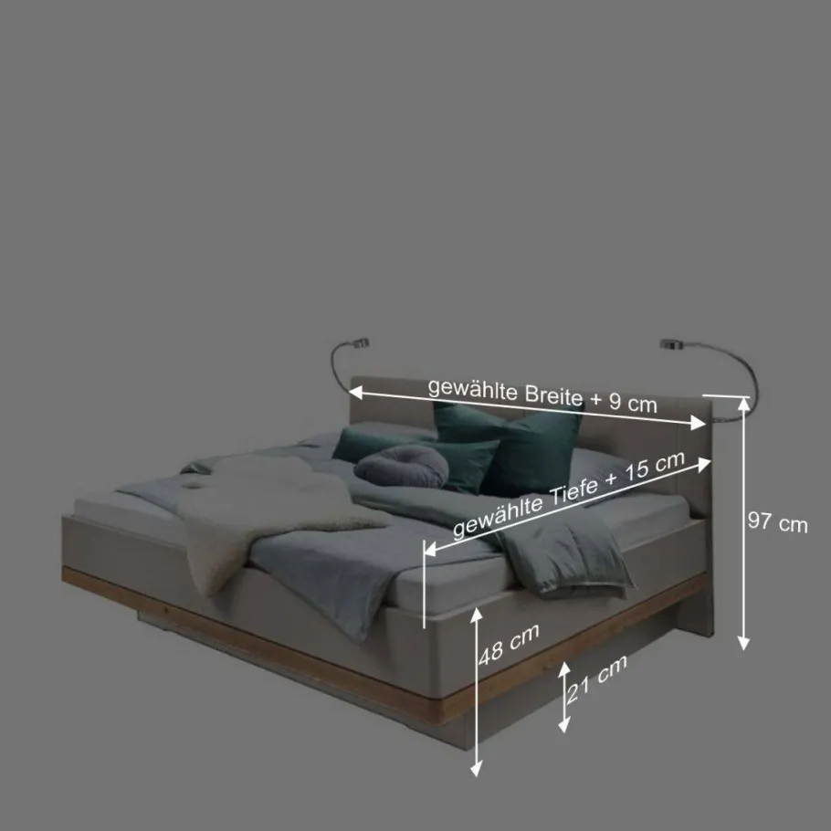 - Zwei LED-Flexleuchten in Chrom-Optik und eine LED-Leiste zur Befestigung hinter dem Kopfteil für die jeweilige Bettbreite