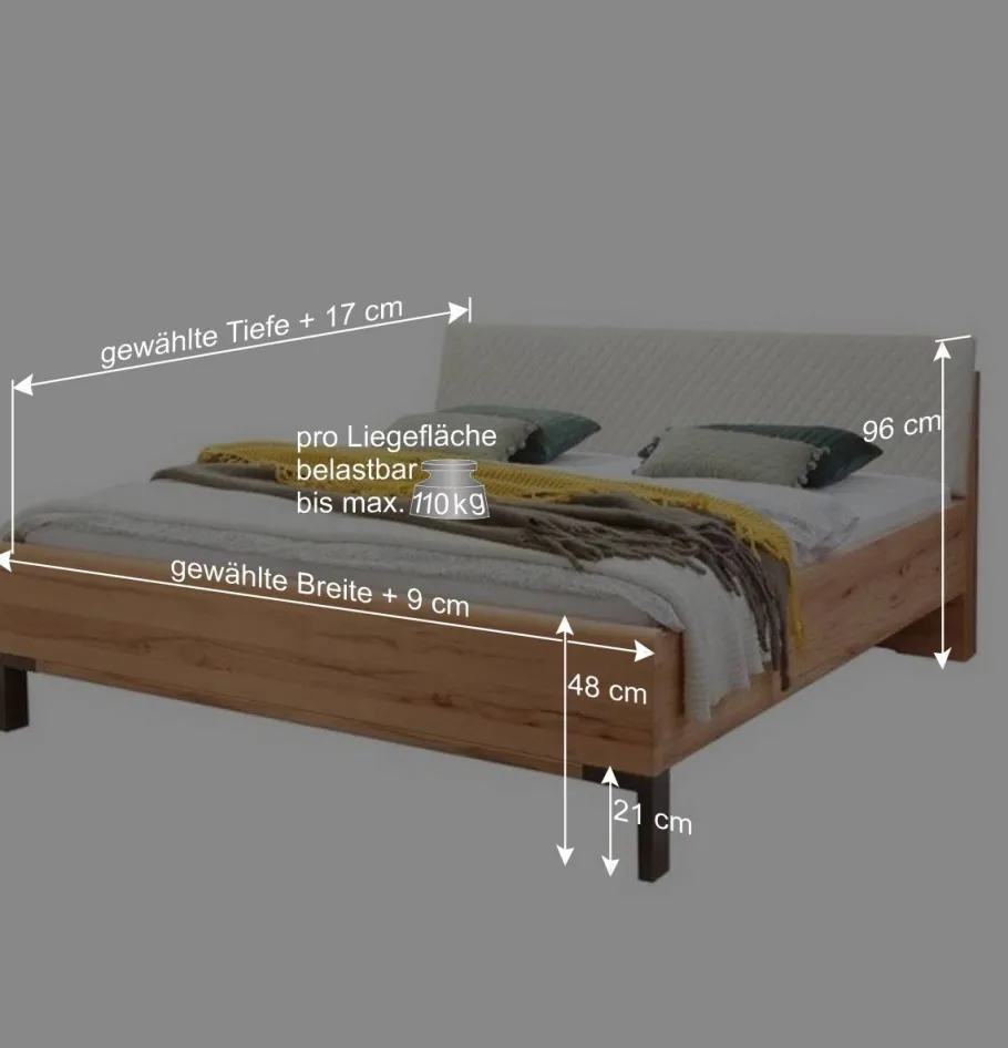 Die Liegefläche des Bettes ist in verschiedenen Größen wählbar, von 180×190 cm bis zu großzügigen 200×220 cm, was Flexibilität für unterschiedliche Raumgrößen und Bedürfnisse bietet. Das Bett ist mit einem Mittelsteg samt Stützfuß ausgestattet, der die Auflage von zwei Lattenrosten ermöglicht und somit eine maximale Belastbarkeit von bis zu 110 kg pro Liegefläche gewährleistet. Die Einlegetiefe für den Lattenrost ist vierfach verstellbar von 11,1-18,3 cm, was Ihnen zusätzlichen Komfort und Anpassungsfähigkeit bietet.