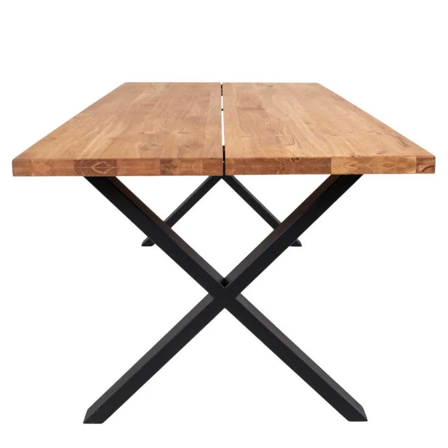 Der Tisch ruht auf einem stabilen, schwarzen Stahlgestell in X-Form. Dieses Design bietet nicht nur eine exzellente Stabilität, sondern ist auch ein echtes Statement im Raum. Das X-Gestell ermöglicht eine besonders gute Gewichtsverteilung und sorgt dafür, dass der Tisch selbst bei intensiver Nutzung stabil und standfest bleibt. Dank der hochwertigen Lackierung ist das Stahlgestell langlebig und robust gegen Kratzer und Abnutzung.