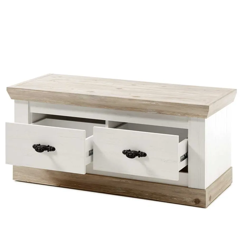 Angefertigt aus robuster Spanplatte, verspricht dieses Garderoben-Set Langlebigkeit und Stabilität. Die Oberflächen sind in einer ansprechenden Holzoptik in Weiß foliert, während Kranzleisten und Sockel in einer Pinie verwittert Optik abgesetzt sind. Die Vorteile der Folierung liegen in ihrer Pflegeleichtigkeit und Beständigkeit, welche die Schönheit Ihrer Möbel langfristig bewahrt.