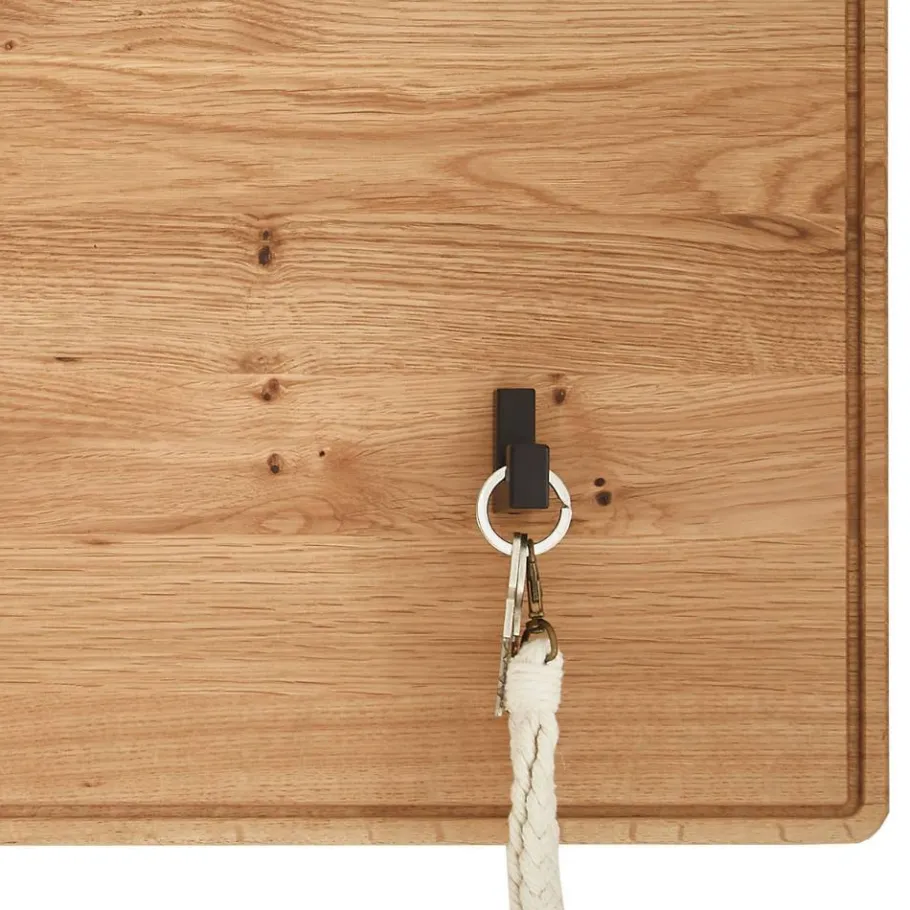 Gefertigt aus Wildeiche Massivholz und schwarzem Metall, überzeugt das Garderobenpaneel „Darcona“ durch seine robuste Qualität und natürliche Ausstrahlung. Die geölten Holzoberflächen betonen die lebendige Maserung und machen jedes Stück zu einem Unikat. Wölbungen und feine Risse sind Ausdruck des natürlichen Spannungsfeldes des Holzes – ein Zeichen echter Handwerkskunst. Ein Verzug von bis zu 1,2 % ist bei Massivholz üblich und stellt keinen Reklamationsgrund dar.