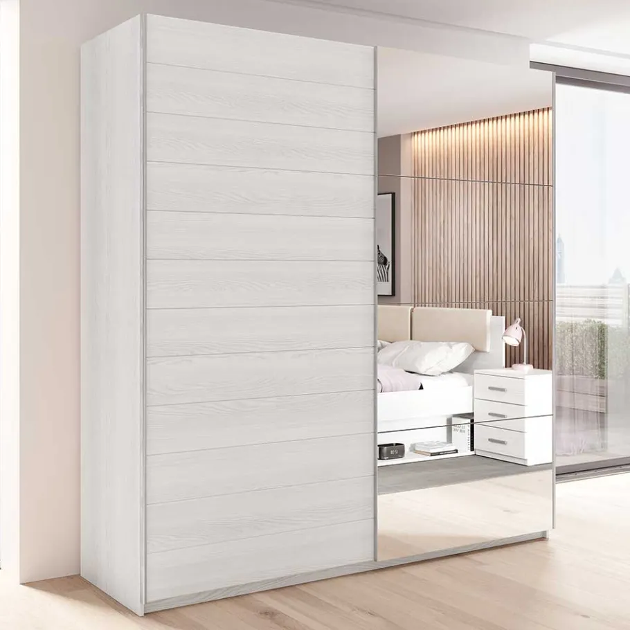 Gefertigt aus robustem Holzwerkstoff (Spanplatte) und veredelt mit Spiegelglas, bietet der Kleiderschrank „Pruducia“ zahlreiche Vorteile. Spanplatte ist nicht nur langlebig und stabil, sondern auch kosteneffizient und umweltfreundlich. Die großzügige Spiegelfläche an der Front verleiht dem Raum eine optische Tiefe und lässt ihn größer und heller erscheinen. Zudem sind die Oberflächen in einer ansprechenden Holzoptik Esche weiß foliert, was dem Schrank ein edles und zeitloses Aussehen verleiht. Die Folierung schützt das Material vor Kratzern und Abnutzung, sodass Sie lange Freude an diesem Möbelstück haben werden.