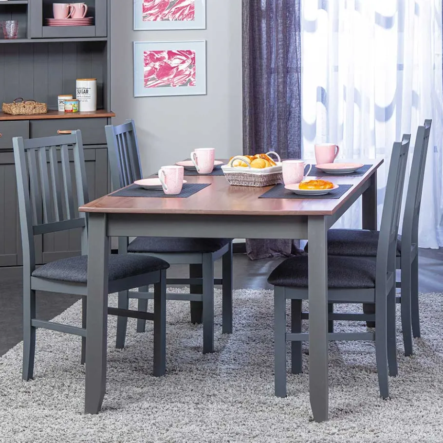 Ein elegantes Zusammenspiel aus Grau und Braun prägt den Look dieser Sitzgruppe. Die Tischplatte setzt mit ihrem warmen Braunton einen natürlichen Akzent, während die restlichen Oberflächen in einem stilvollen Grau gehalten sind. Beide Farbtöne ergänzen sich hervorragend – sie wirken beruhigend, zeitlos und lassen sich mit verschiedensten Einrichtungsstilen kombinieren. Dank der durchscheinenden Maserung bleibt die natürliche Struktur des Holzes sichtbar und verleiht jedem Möbelstück eine individuelle Note.