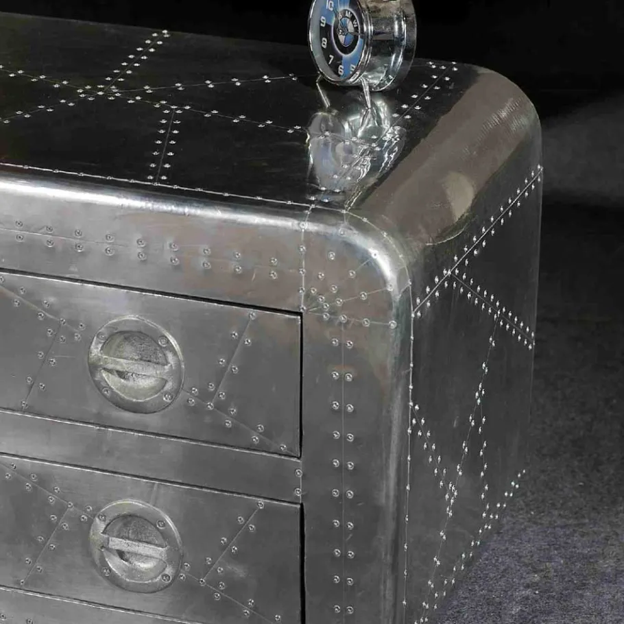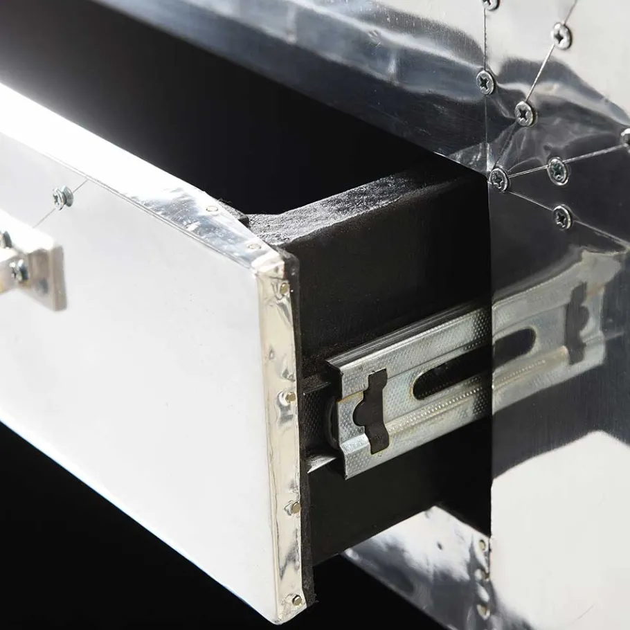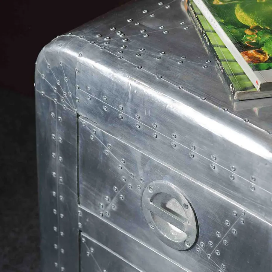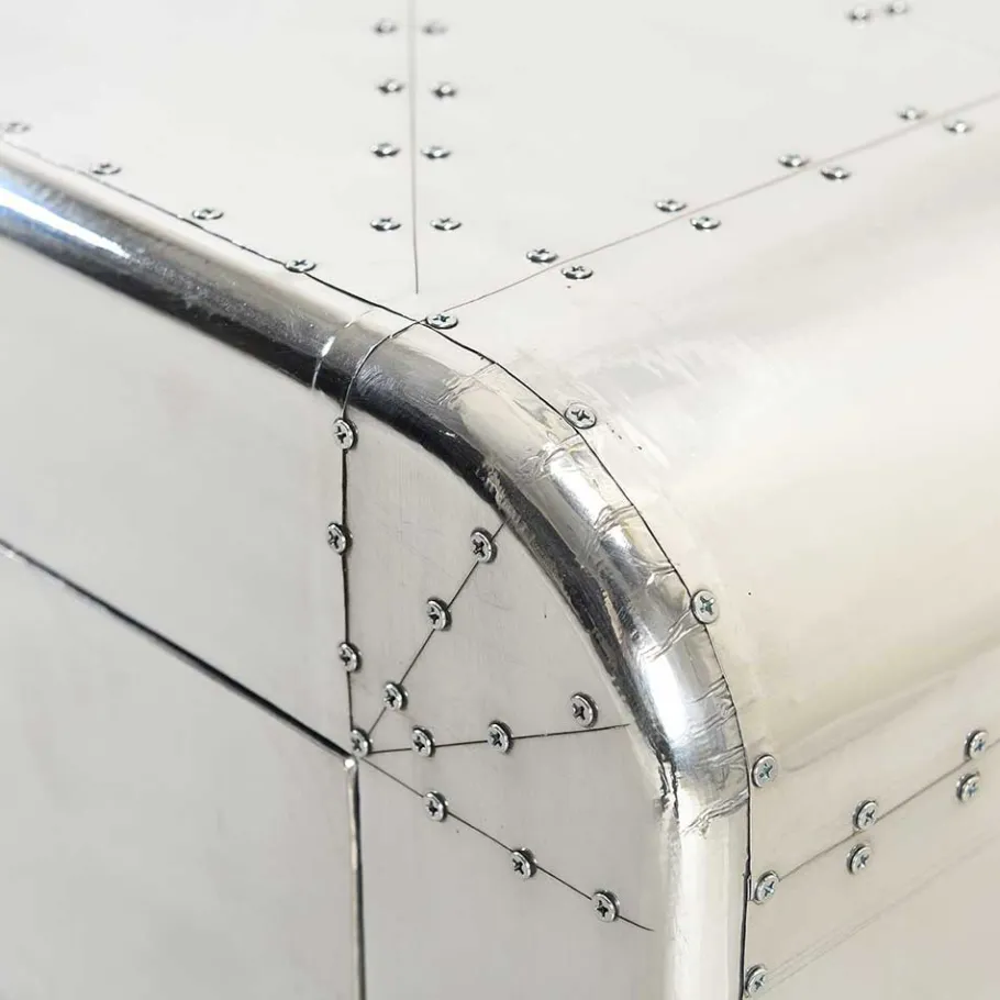 Um dem Ganzen noch die Krone aufzusetzen, sind alle Oberflächen mit Aluminium beschlagen und mit Zierschrauben versehen. Dieser Aluminiumbeschlag verleiht dem Möbelstück nicht nur einen modernen, industriellen Look, sondern schützt es auch effektiv vor Abnutzung und Kratzern. Die abgerundeten Korpuskanten runden das Design ab und verleihen dem Lowboard eine geschmeidige, einladende Ausstrahlung.