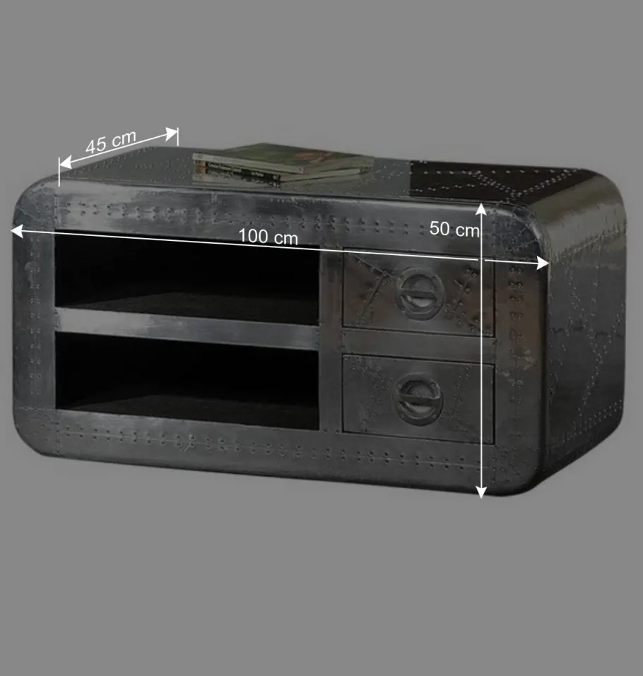 Mit seinen Maßen von 100 cm Breite, 50 cm Höhe und 45 cm Tiefe ist das „Pilot“ Lowboard ideal geeignet, um Fernsehgeräte aller Größen stilsicher zu präsentieren und gleichzeitig ausreichend Stauraum für alle Ihre Mediengeräte und Zubehör zu bieten. Die zwei offenen Gerätefächer, innen schwarz ausgekleidet, ermöglichen eine ordentliche und zugängliche Aufbewahrung Ihrer wichtigsten Unterhaltungselektronik. Dank des praktischen Lochs in der Rückwand für die Kabelführung gehört der Kabelsalat der Vergangenheit an.