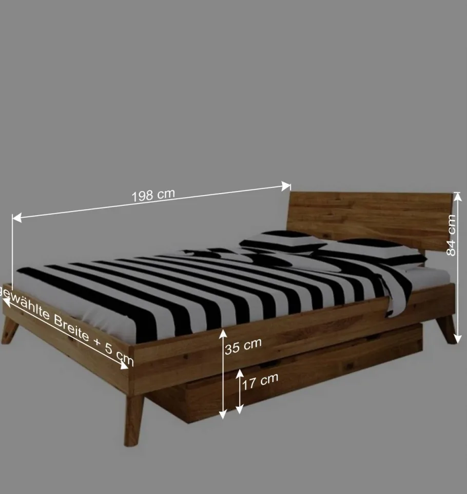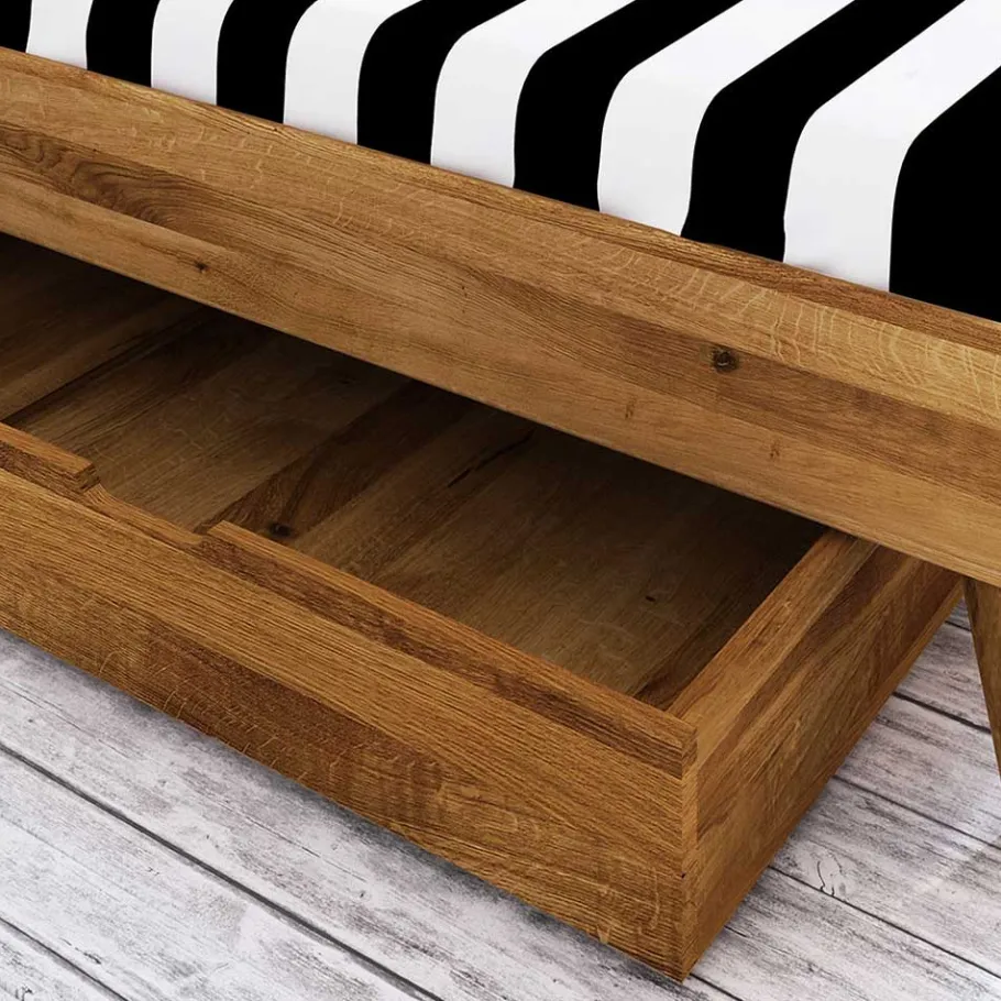 Das aus massivem Wildeicheholz gefertigte Bett „Eavy III“ bringt die Beständigkeit und Stärke der Natur direkt in Ihr Schlafzimmer. Die lebhafte Holzmaserung jedes Bettes ist einzigartig, was Ihr Möbelstück zu einem Unikat macht. Durch die natürliche Ölung der Oberfläche wird das Holz geschützt und dessen natürliche Schönheit hervorgehoben, während es gleichzeitig atmungsaktiv bleibt. Diese Behandlung schützt das Holz zudem vor alltäglichen Abnutzungserscheinungen und erleichtert die Pflege.