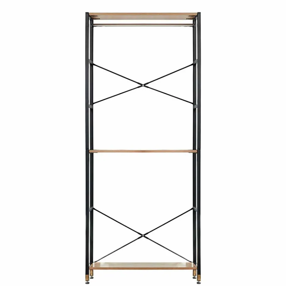Unterhalb der Böden befinden sich zwei Kleiderstangen aus Metall, die sich perfekt zum Aufhängen von Jacken oder Schals eignen. Die offene Rückwand wird durch formschöne Metall X-Streben ergänzt, die nicht nur für zusätzliche Stabilität sorgen, sondern auch einen optischen Akzent setzen.