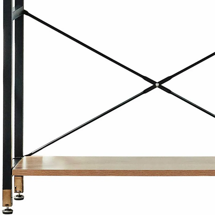 Das Gestell besteht aus pulverbeschichtetem Metall. Die Pulverbeschichtung dient dazu, das Metall vor Korrosion zu schützen und ihm ein gleichmäßiges, attraktives Aussehen zu verleihen. Das tiefe Schwarz des Gestells bildet einen starken Kontrast zur Holzoptik der MDF-Böden und unterstreicht den industriellen Charme des Möbelstücks.