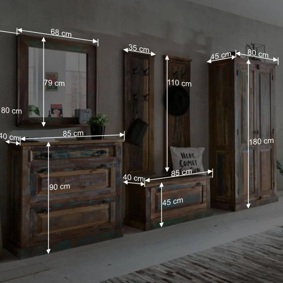 - Besteht aus Schuhschrank, Spiegel, zwei Paneele, Schrank und Schuhbank