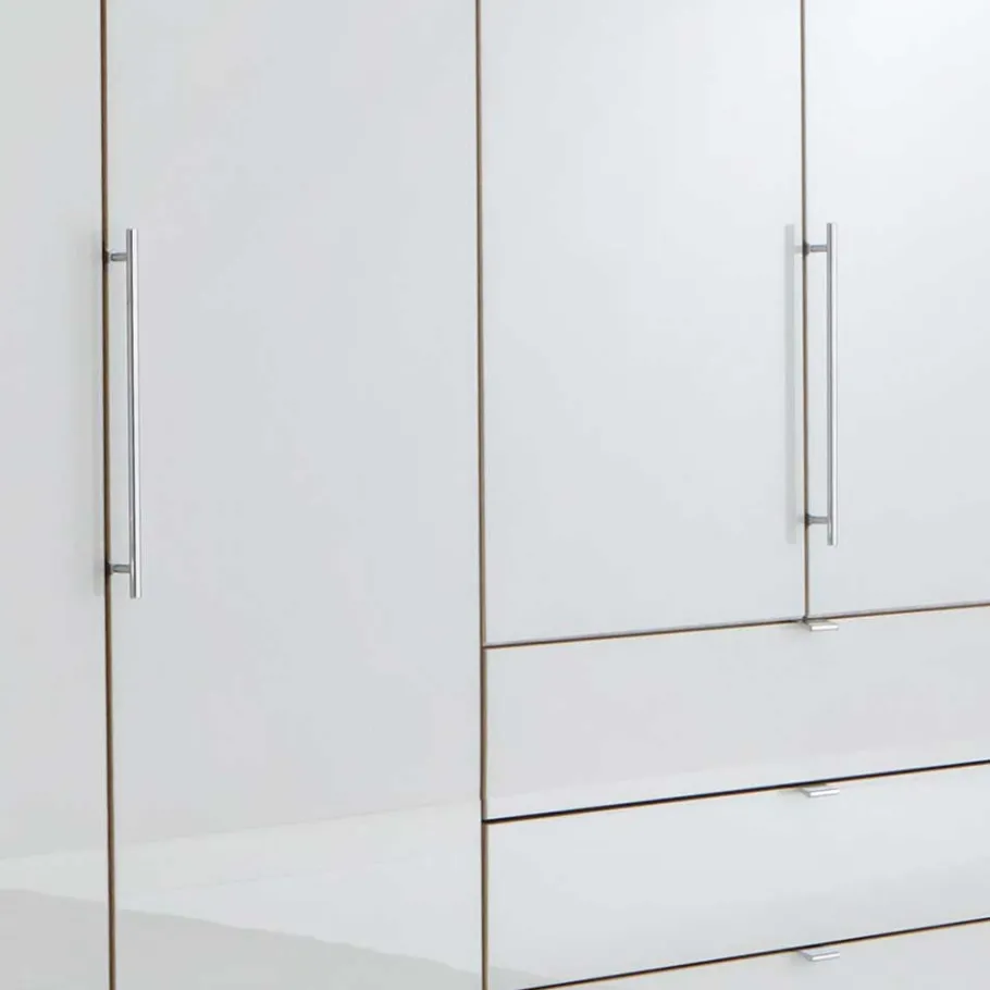 Der Korpus in edlem Hellgrau, kombiniert mit Fronten aus weißem Glas, verleiht dem Kleiderschrank eine moderne und erfrischende Optik. Die Folierung des Korpus bietet zahlreiche Vorteile: Sie ist pflegeleicht, widerstandsfähig gegen Kratzer und erleichtert die Reinigung – ein ideales Merkmal für den alltäglichen Gebrauch.