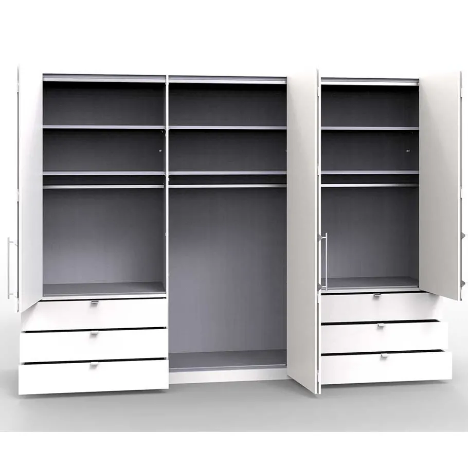Drei Panorama-Falttüren, gestaltet in einer Sechs-Türen-Optik, ermöglichen einen komfortablen Zugang zu Ihren Kleidungsstücken. Dank der hochwertigen Metallbeschläge lassen sich die Türen leichtgängig öffnen und bieten zugleich eine platzsparende Lösung für jedes Schlafzimmer. Hinter den Türen erwarten Sie drei großzügig gestaltete Fachelemente, jeweils ausgestattet mit zwei Einlegeböden und einer Kleiderstange – ideal, um Ordnung und Übersichtlichkeit zu bewahren.