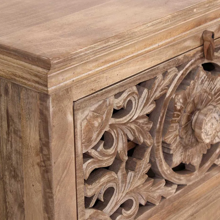 Ein besonderes Highlight dieses Sets sind die aufwändigen floralen Schnitzereien, die die Fronten der Möbel dekorativ schmücken. Jedes Detail ist mit großer Sorgfalt gestaltet worden, um Ihnen ein einzigartiges Stück Handwerkskunst zu bieten. Formschön gefräste Kanten verleihen den Möbeln eine elegante Note und unterstreichen den hochwertigen Charakter.