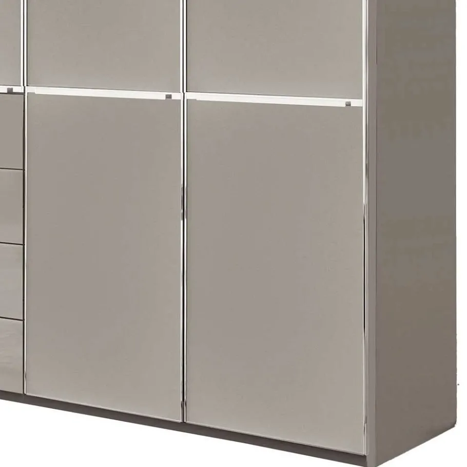Der Schrank besteht aus hochwertigem Holzwerkstoff Spanplatte und überzeugt mit pflegeleichten Fronten, die durch die Glasbeschichtung besonders strapazierfähig sind. Die stilvollen Metall-Kantengriffe in Chrom sowie die eleganten Griffleisten für die Türen setzen dezente Akzente. Das praktische Sockelgestell sorgt für einen sicheren Stand und rundet das moderne Erscheinungsbild ab. Im Inneren begeistert der Schrank mit einer eleganten Silber-Grau Folierung und bietet Ihnen großzügigen Stauraum.