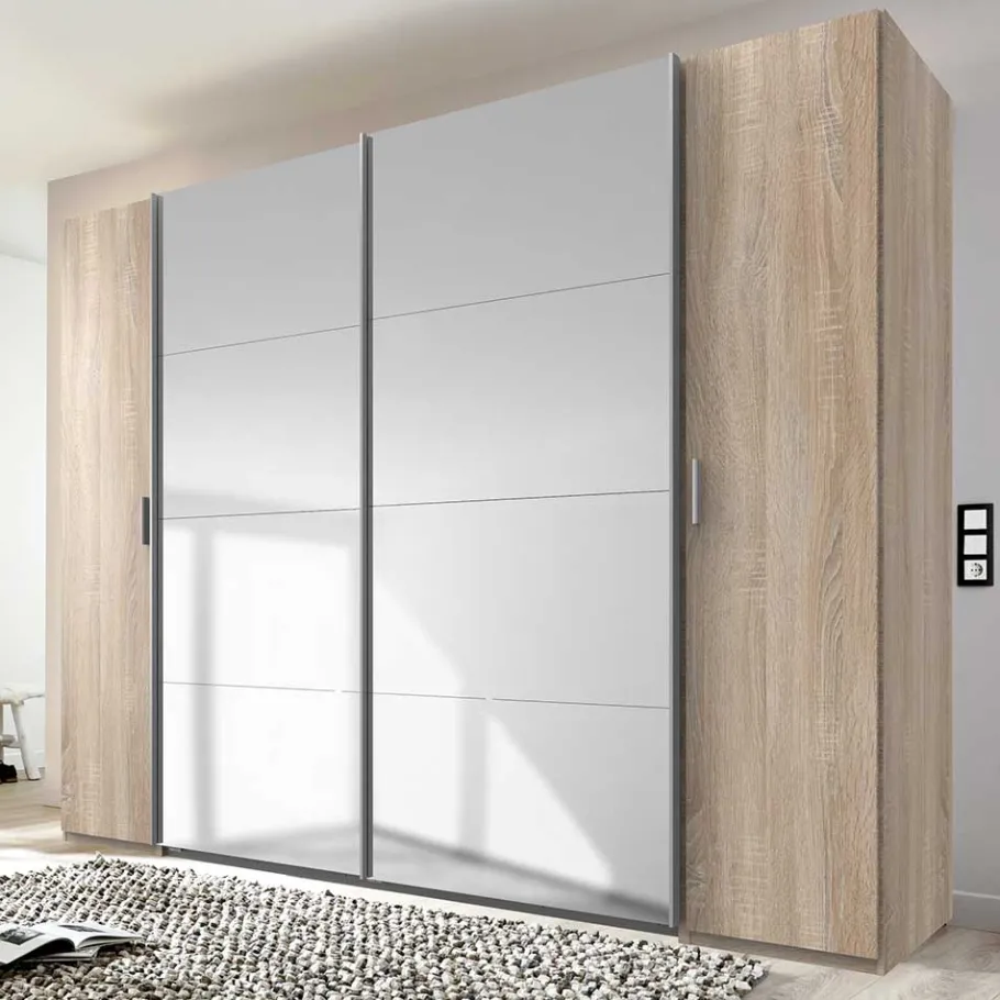 Mit einer beeindruckenden Breite von 272 cm, einer Höhe von 210 cm und einer Tiefe von 65 cm bietet der Kleiderschrank „Metrona“ großzügigen Stauraum für all Ihre Kleidungsstücke. Die durchdachte Unterteilung des Schranks sorgt für Übersichtlichkeit und Ordnung. Mittig befinden sich zwei leichtgängige Schwebetüren, die nicht nur einfach zu bedienen sind, sondern auch Platz sparen. Außen ergänzen zwei Drehtüren mit stabilen Metallbeschlägen das praktische Design.