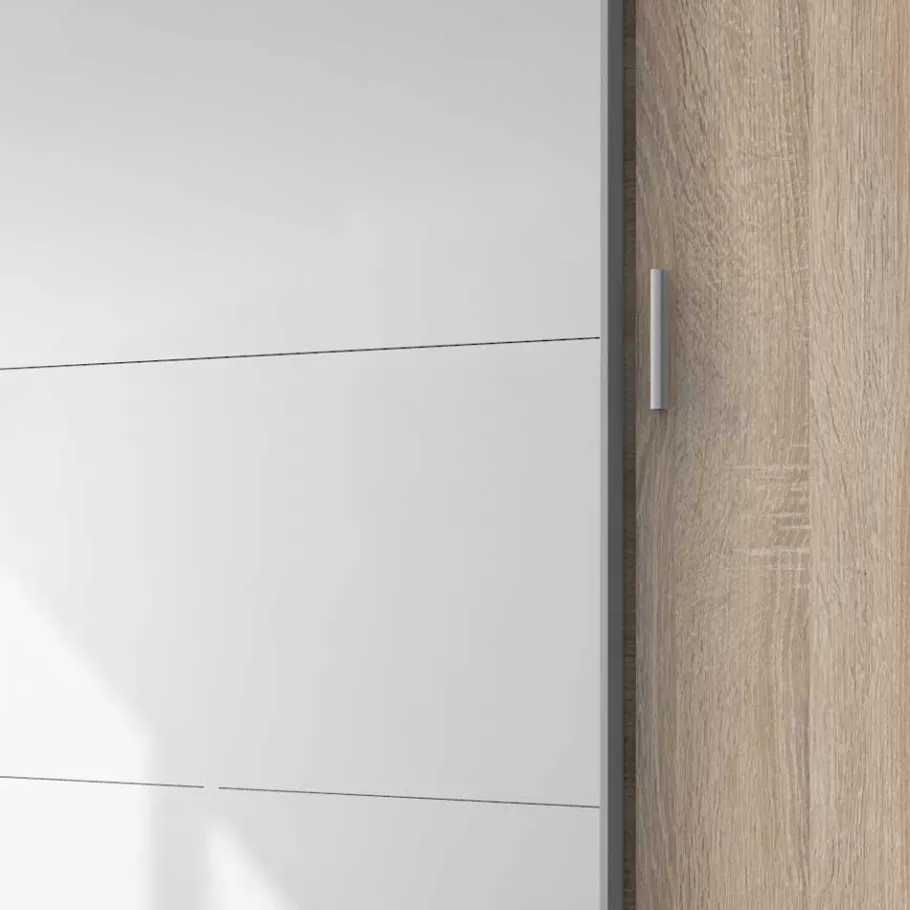 Die handlichen Metallgriffleisten in Alufarben an den Schwebetüren und die kurzen Kunststoff-Griffleisten an den Drehtüren unterstreichen den modernen Look des Kleiderschranks „Metrona“. Sie erleichtern das Öffnen und Schließen der Türen und verleihen dem Möbelstück eine zusätzliche elegante Note.