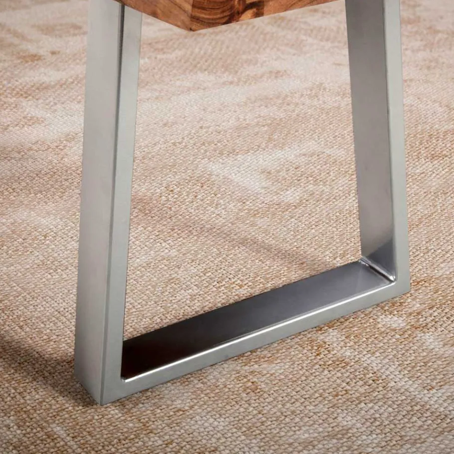 Die Bank steht auf einem Gestell aus Trapez-Bügelbeinen, die aus verchromtem Metall gefertigt sind. Diese stilvollen Beine garantieren nicht nur einen sicheren und stabilen Stand, sondern ergänzen auch das moderne Design der Bank perfekt. Die Kombination von massivem Holz und glänzendem Chrom verleiht der Bank eine zeitlose Ästhetik, die sowohl in industrielle als auch minimalistische Wohnkonzepte passt.
