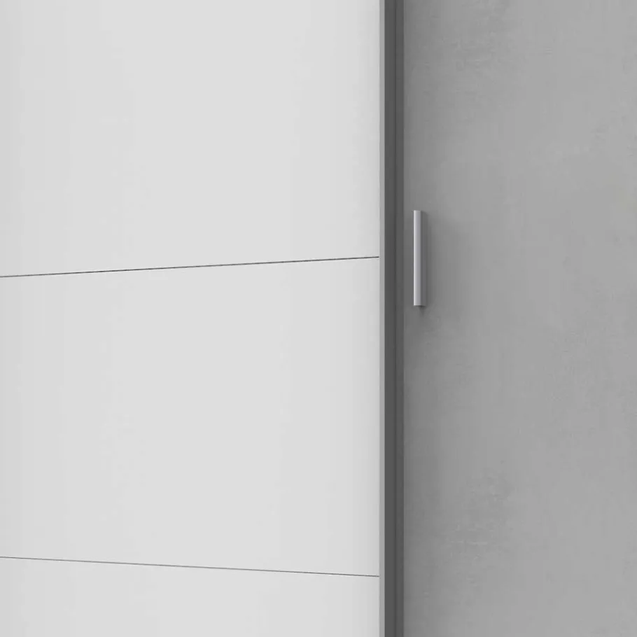 Der Kleiderschrank „Viganno“ bietet eine praktische Unterteilung mit großem Stauraumangebot. Mittig befinden sich zwei leichtgängige Schwebetüren in Weiß, die sich dank handlicher Metallgriffleisten in Alufarben bequem öffnen und schließen lassen. Außen befinden sich zwei graue Drehtüren mit stabilen Metallbeschlägen und kurzen Kunststoff-Griffleisten, die den modernen Look unterstreichen. Diese Kombination aus Schwebetüren und Drehtüren ermöglicht einen flexiblen Zugang und eine optimale Raumnutzung.