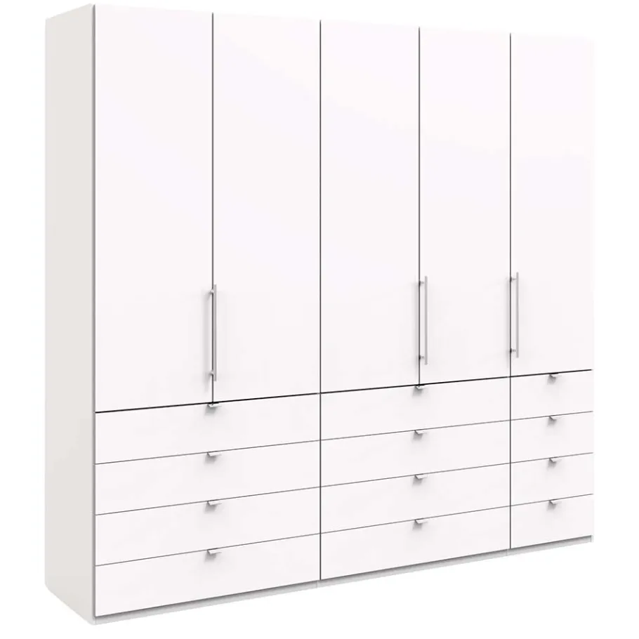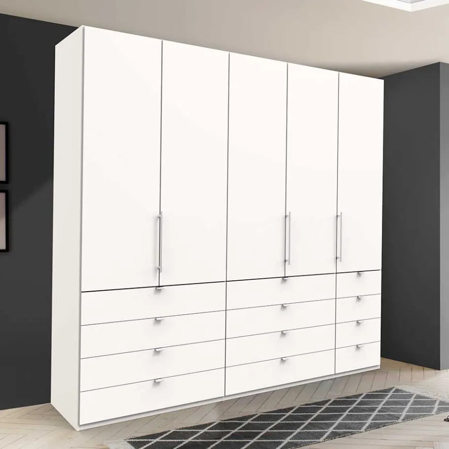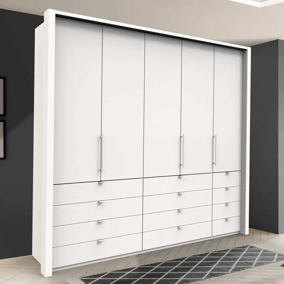 Mit seinen beeindruckenden Maßen von 250 cm Breite, 236 cm Höhe und 58 cm Tiefe – optional erweiterbar durch einen Passepartout-Rahmen auf 257 cm Breite und 240 cm Höhe – bietet der „Donpiave“ großzügigen Stauraum für all Ihre Kleidung und Accessoires. Die Kombination aus einer rechten Drehtür mit Dämpfung und zwei panoramaartigen Falttüren in der Mitte und links schafft nicht nur ein visuelles Highlight, sondern ist auch besonders platzsparend. Die Falttüren, die eine Zwei-Türen-Optik imitieren, lassen sich leicht nach vorne ziehen, was Ihnen einen bequemen Zugang zu Ihren Habseligkeiten ermöglicht.
