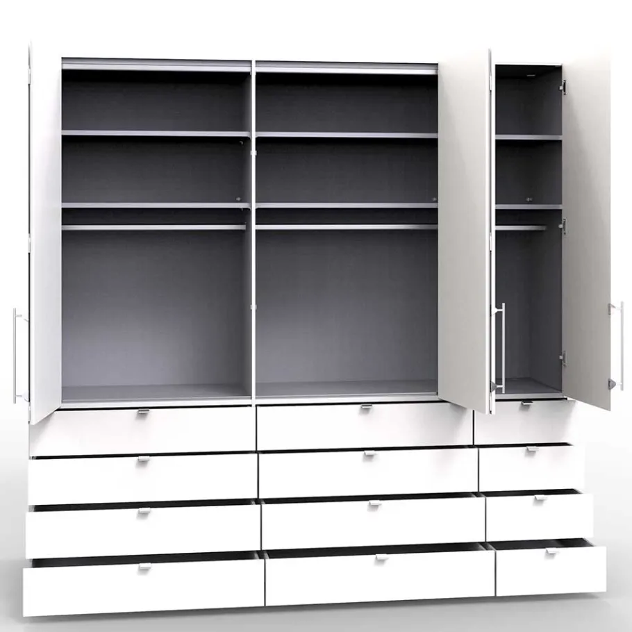 Im Inneren des Schrankes erwartet Sie eine wohlorganisierte Welt: Drei Fachelemente, jedes ausgestattet mit zwei Einlegeböden und einer stabilen Metall-Kleiderstange, sorgen für Ordnung und Übersicht. Die zwölf Schubkästen in zwei verschiedenen Größen bieten mit ihrem Metallauszug, der Soft-Close-Funktion und dem Selbsteinzug ein sanftes und geräuschloses Bedienerlebnis.