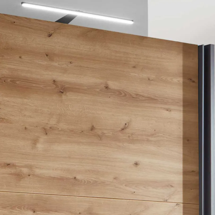 Die Oberflächen des Schrankes sind in Eiche Bianco Holzoptik und Anthrazit foliert. Diese Folierung macht den Schrank nicht nur äußerst pflegeleicht, sondern gibt ihm zudem eine natürliche und zugleich elegante Ausstrahlung. Flecken oder Staub lassen sich leicht entfernen, wodurch er sich ideal für den Alltag eignet.