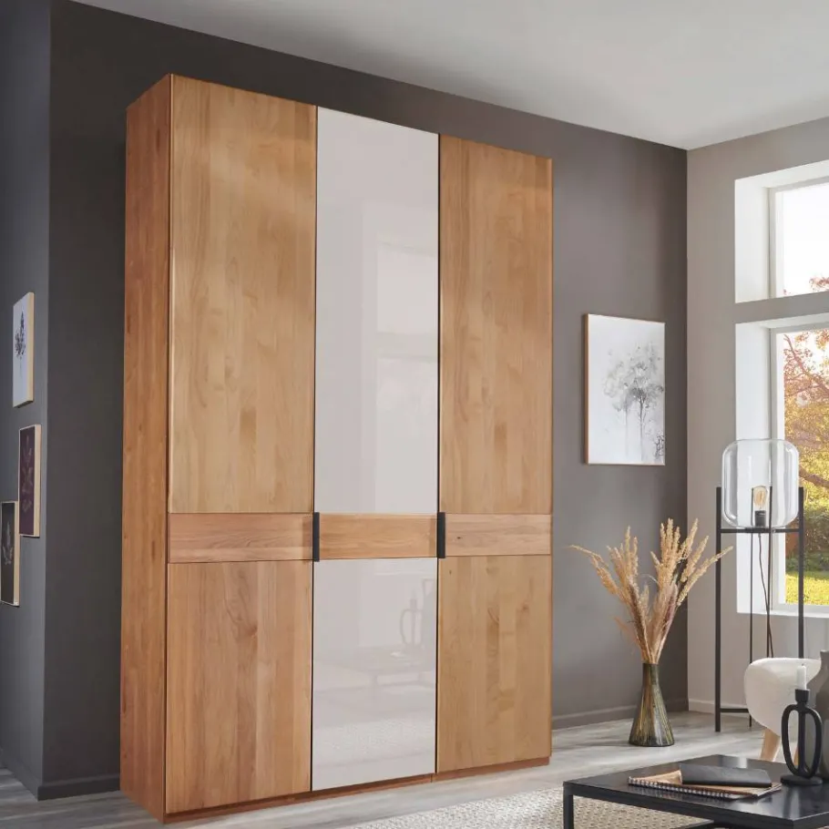 Der 3-türige Schlafzimmerschrank „Dilacco“ vereint moderne Klarheit mit natürlichem Charme und bringt eine ruhige, zeitgemäße Atmosphäre in Ihr Zuhause. Die Kombination aus weißer Glasoptik und warmem Erlenholz verleiht dem Möbelstück eine elegante Ausstrahlung, die sich harmonisch in verschiedenste Einrichtungsstile einfügt. Gefertigt in Deutschland, steht „Dilacco“ für hochwertige Verarbeitung und ein Design, das Funktion und Ästhetik gekonnt verbindet.
