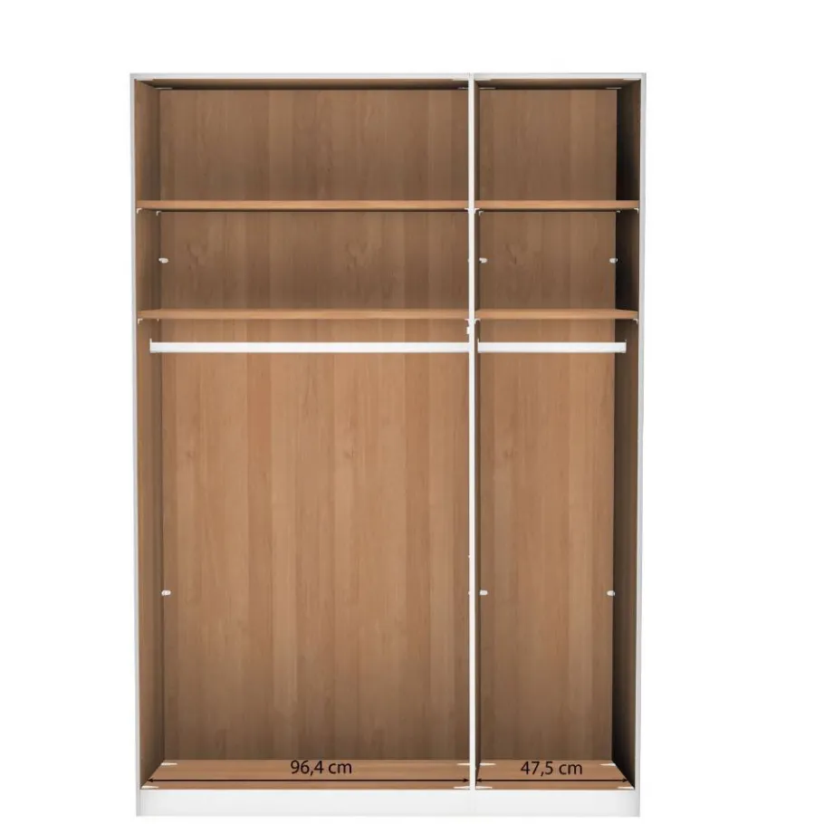 Alle Türen sind mit hochwertigen Soft-Close-Metallscharnieren ausgestattet, die ein sanftes und geräuschloses Schließen ermöglichen. Im Inneren bietet der Schlafzimmerschrank zwei Fachabteile: ein breites mit 96,4 cm und ein schmales mit 47,5 cm Breite. Beide Bereiche sind mit jeweils zwei Einlegeböden (22 mm stark, bis 20 kg belastbar) und einer stabilen Metallkleiderstange (bis 40 kg belastbar) ausgestattet. Die Rückwände aus eingenuteter Hartfaser sind mit vier Metallhaltern pro Fach zuverlässig fixiert. Der durchgehende Sockelboden sorgt für stabilen Stand – eine Kippsicherung an der Wand wird empfohlen.