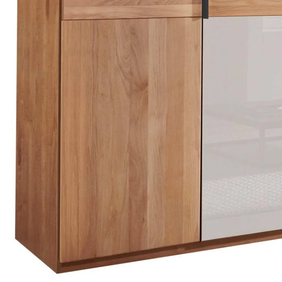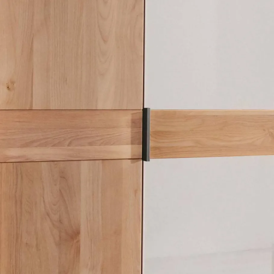 Die drei Türen setzen sich aus zwei Elementen aus massivem Erlenholz und einer mittig platzierten Tür aus Holzwerkstoff mit weißer Glasbeschichtung zusammen. Eine Bauchbinde aus Erle Massivholz unterstreicht den natürlichen Look. Der Korpus besteht aus folierter Spanplatte in Holzoptik. Die Massivholzflächen sind sorgfältig lackiert, die Glasbeschichtung veredelt die Holzwerkstoff-Tür mit moderner Raffinesse. Schiefergraue Griffe aus Aluminium fügen sich dezent ins Gesamtbild ein und runden das Design stilvoll ab.