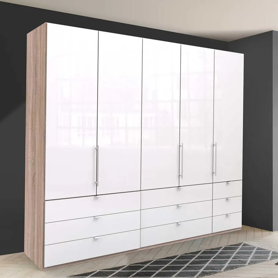 Öffnen Sie die Türen des Schrankes und entdecken Sie die clevere Innenaufteilung. Auf der rechten Seite befindet sich eine Drehtür mit Dämpfung für bequemen Zugriff. Auf der linken und mittigen Seite erwarten Sie jeweils Panorama-Falttüren in einer Zwei-Türen-Optik. Diese praktische Gestaltung ermöglicht ein platzsparendes Öffnen nach vorn und erlaubt einen großzügigen Zugang zu Ihrem Kleiderschrankinhalt.