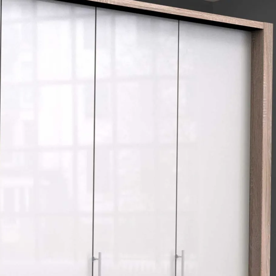 Die weiße Front des Kleiderschrankes ist mit einer exquisiten Glasbeschichtung versehen, die nicht nur ästhetisch ansprechend ist, sondern auch einige praktische Vorteile mit sich bringt. Die Glasbeschichtung verleiht dem Schrank eine zeitlose Eleganz und sorgt für ein angenehm leichtes Erscheinungsbild. Zudem ist die Oberfläche leicht zu reinigen und bleibt dadurch immer strahlend schön.