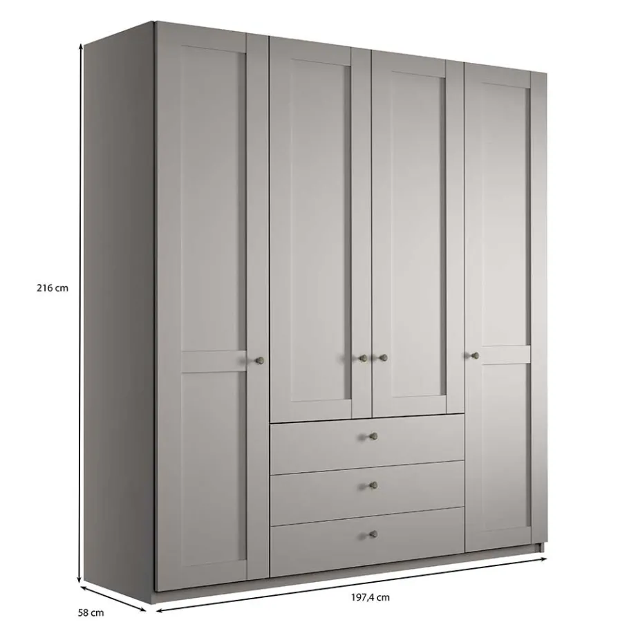 Mit Maßen von 200 cm Breite, 216 cm Höhe und 58 cm Tiefe bietet dieser Kleiderschrank beeindruckenden Stauraum. Sollten Sie den Wunsch nach einem etwas majestätischeren Auftritt haben, kann optional eine Kranzleiste hinzugefügt werden, welche die Höhe auf 220 cm und die Tiefe auf 65 cm erhöht.