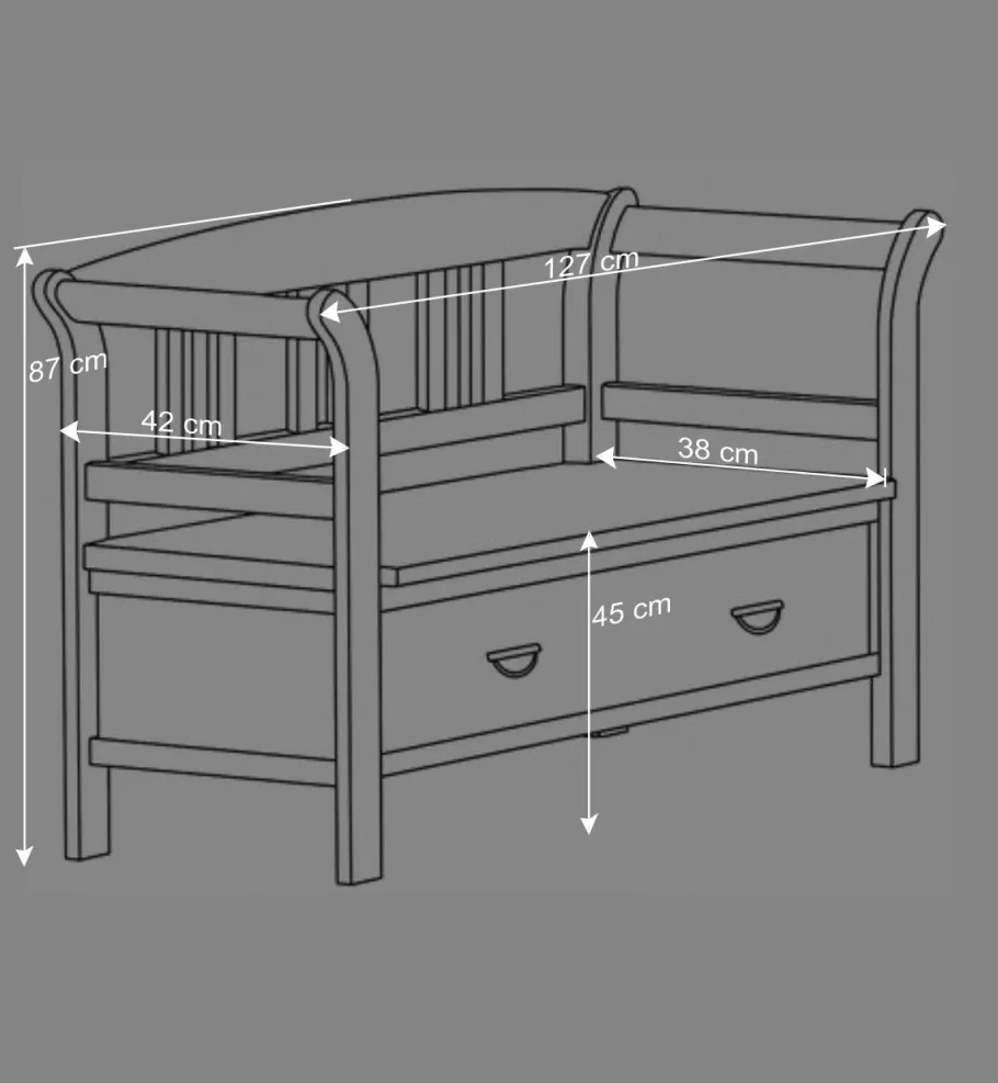 Mit einer Breite von 127 cm, einer Sitzhöhe von ca. 49 cm und einer komfortablen Höhe von 87 cm bietet die Bank großzügigen Platz – ob beim Anziehen im Flur oder beim entspannten Frühstück in der Küche. Die leicht gebogenen Armlehnen erhöhen den Sitzkomfort, während die gerade Rückenlehne mit senkrechten Verstrebungen für optische Ruhe sorgt. Unter der Sitzfläche verbirgt sich eine geräumige Schublade, die sich dank zwei eleganter Metallgriffe und leichtgängiger Metallschienen besonders komfortabel öffnen lässt. Hier finden Hausschuhe, Kissen oder Alltagskleinigkeiten stilvoll ihren Platz.
