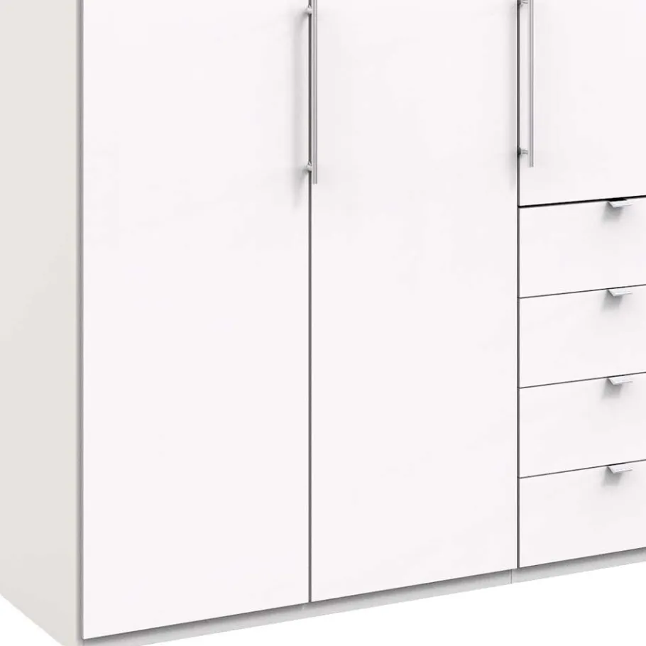 Hinter den eleganten Türen verbirgt sich ein durchdachtes Innenleben: Drei Fachelemente mit den Breiten 96,4 cm, 47,5 cm und wiederum 96,4 cm sind jeweils mit zwei Einlegeböden und einer robusten Metall-Kleiderstange ausgestattet, die genügend Platz für Ihre Garderobe bieten. Zusätzlich verfügen vier Schubkästen über einen hochwertigen Metallauszug, der mit Soft-Close- und Selbsteinzug-Technik ausgerüstet ist, für ein sanftes und leises Schließen.