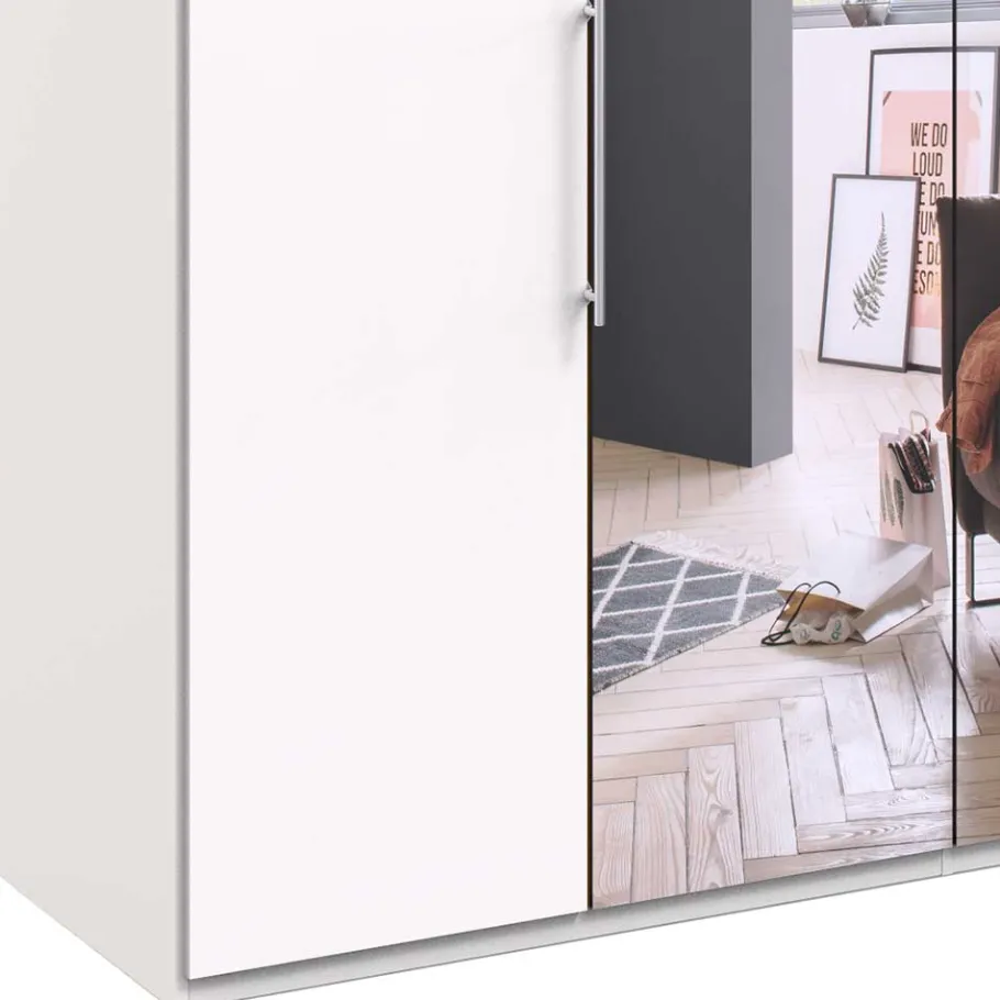 Die zwei Panorama-Falttüren, welche eine Vier-Türen-Optik simulieren, sind ein Highlight in Sachen Design und Funktionalität. Sie gleiten sanft nach vorne und bieten einen komfortablen Zugang zum Innenraum, ohne zusätzlichen Platz zu beanspruchen. Ausgestattet mit Ganzkörperspiegeln aus Parsol-Bronze in den mittleren Türfronten, erleichtern sie nicht nur die tägliche Outfitwahl, sondern lassen Räume größer und heller erscheinen.