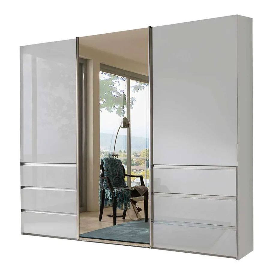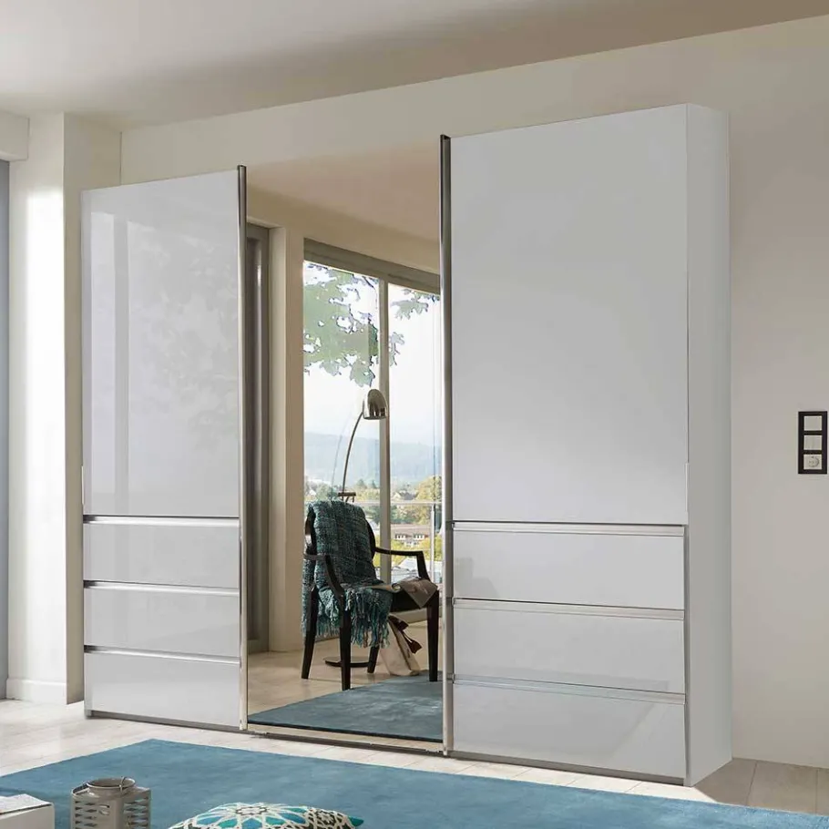 Der Schwebetürenschrank „Amelie“ besticht durch sein zeitloses, modernes Design. Gefertigt aus stabilen Spanplatten, überzeugt er durch Langlebigkeit und Widerstandsfähigkeit. Spanplatten bieten eine hervorragende Stabilität bei gleichzeitiger Leichtigkeit, was den Schrank nicht nur robust, sondern auch leicht zu handhaben macht. Der Korpus ist in Weiß foliert, wodurch er sich in jede Wohnumgebung harmonisch einfügt. Die Frontflächen sind mit hochwertigem weißem Glas beschichtet, was dem Schrank eine edle, glänzende Optik verleiht. Das Innendekor in Silber-Grau gestreift sorgt zudem für einen eleganten Kontrast und eine hochwertige Anmutung.