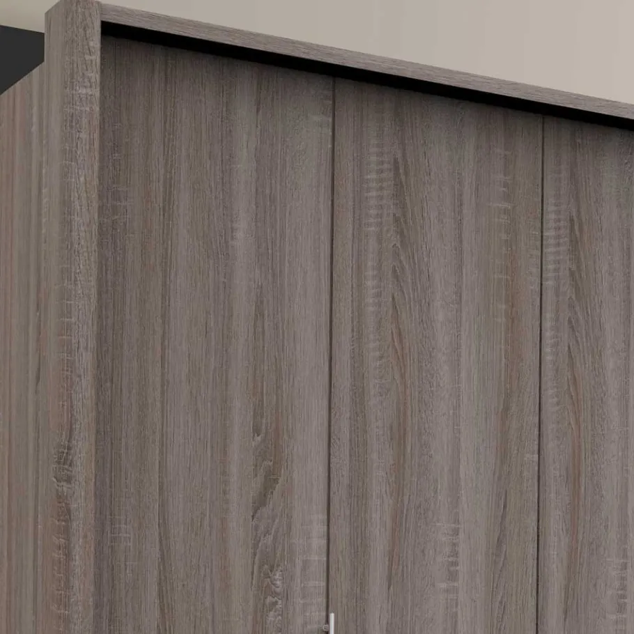 Der Kleiderschrank „Crenba“ wird aus robuster Spanplatte gefertigt, die langlebig und stabil ist. Die Oberflächen sind in einer ansprechenden Holzoptik Eiche Trüffelfarben foliert, was nicht nur für eine natürliche Ästhetik sorgt, sondern auch eine besonders pflegeleichte und strapazierfähige Oberfläche gewährleistet. Diese Folierung schützt den Schrank vor Kratzern und Abnutzungsspuren und bewahrt seine Schönheit über lange Jahre hinweg.