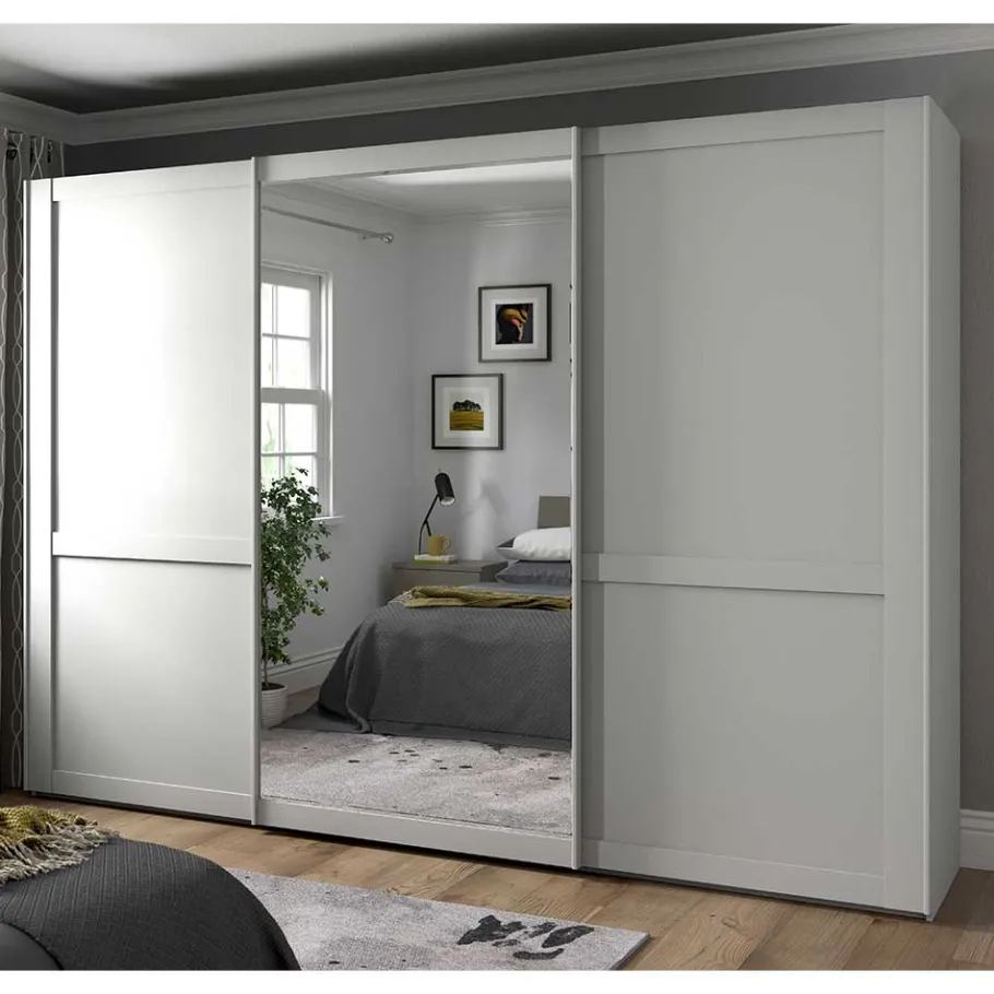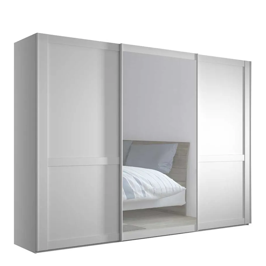 Die beiden leichtgängigen Schwebetüren des Schrankes ermöglichen einen mühelosen Zugang zu Ihrem Kleidungsstück. Die Türfronten sind in einer dezenten Kassettenoptik gestaltet, was dem Schrank einen besonderen Charme verleiht. Die mittlere Türfront birgt einen praktischen Ganzkörperspiegel, der Ihnen morgendliche Styling-Routinen erleichtert.