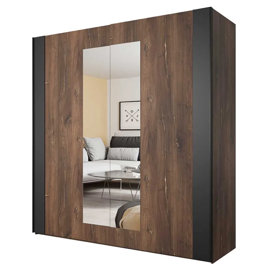 Der Schwebetürenschrank Prabhaa ist mehr als ein funktionales Möbelstück – er ist ein Eyecatcher, der Ihrem Schlafzimmer einen Hauch urbaner Extravaganz verleiht. Die kraftvolle Ausstrahlung des Loft-Stils gepaart mit der wohnlichen Wärme dunkler Eiche macht ihn zum stilbildenden Zentrum jedes Raumes.