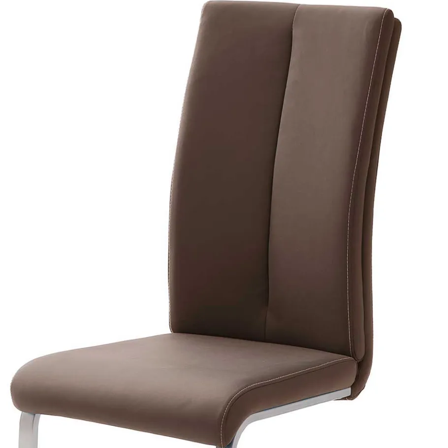 Die Stühle aus der Serie „Lemgo“ begeistern mit klaren Linien und einer modernen, leicht kantigen Formgebung, die jedem Essbereich eine elegante, aber unaufdringliche Note verleiht. Das Zusammenspiel aus weichem, braunem Kunstlederbezug und dem kühlen, matt gebürsteten Edelstahlgestell schafft eine faszinierende Balance zwischen Behaglichkeit und urbanem Chic. Die cremefarbene Kontrastnaht verleiht den Stühlen eine feine handwerkliche Raffinesse – ein stilvolles Detail, das Qualität sichtbar und fühlbar macht.