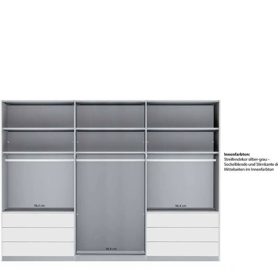 Hinter den eleganten Schwebetüren verbergen sich drei großzügige Facheinheiten, jede mit einer Breite von 96,4 cm. Jede Facheinheit ist mit einer stabilen Kleiderstange aus Metall und zwei praktischen Einlegeböden ausgestattet, die reichlich Platz für Ihre Kleidung und Accessoires bieten. Zusätzlich finden Sie jeweils links und rechts drei geräumige Schubkästen mit Metallauszug. Dank der Soft-Close-Funktion und dem Selbsteinzug schließen diese Schubkästen sanft und leise, was den Komfort im Alltag deutlich erhöht.