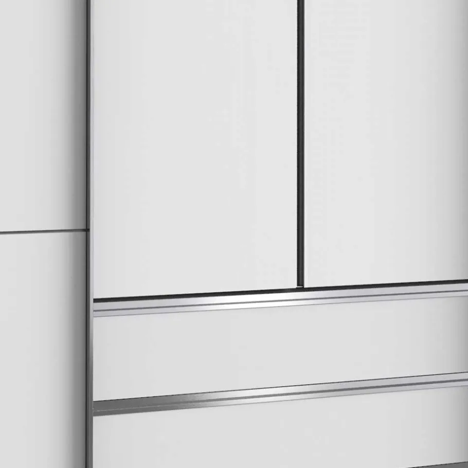 Lange Metall Griffleisten und -mulden in Chromfarben setzen nicht nur optische Akzente, sondern erleichtern auch die Bedienung. Diese Designelemente ergänzen das moderne Aussehen des Schranks und unterstreichen seine Exklusivität.