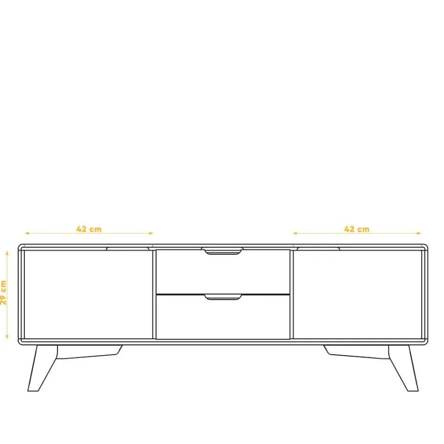Das Lowboard steht stabil auf einem schräg konstruierten Vierfußgestell. Die langlebigen, gedämpften Metallbeschläge an den Türen gewährleisten zudem eine hohe Lebensdauer und Beständigkeit.