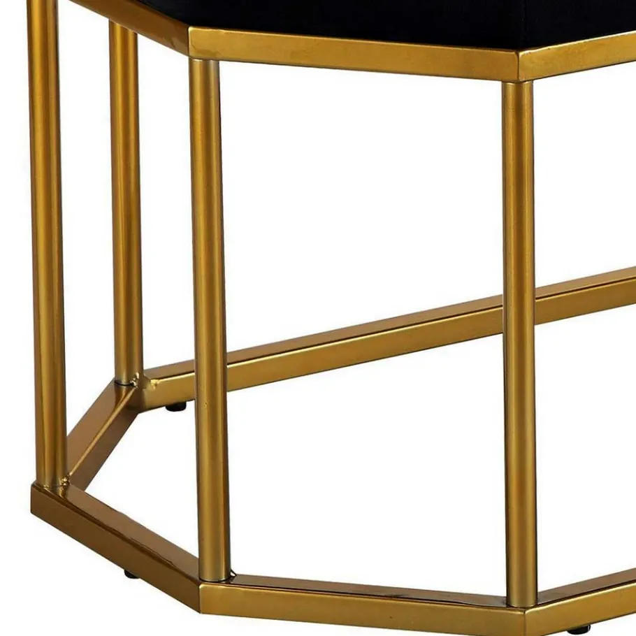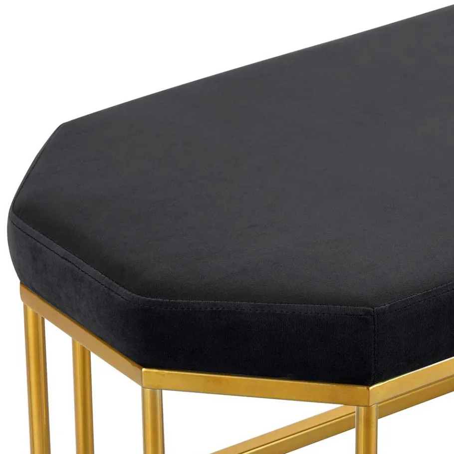 Bank „Coal“ ist nicht einfach nur ein Sitzmöbel – sie ist ein echtes Design-Statement. Inspiriert vom edlen Retrostil, verbindet sie die klaren Linien der Mid-Century-Ästhetik mit modernen Akzenten. Die Kombination aus der achteckigen Form, dem tiefschwarzen Samtbezug und dem goldfarben pulverbeschichteten Metallgestell schafft eine harmonische Balance aus Eleganz, Glamour und markanter Individualität.